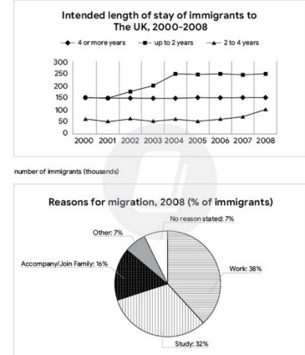 The graph and chart below give information about migration to the UK. The graph below shows how long immigrants in the year 2000-2008 intended to stay in the UK. And the pie-chart shows reasons for migration in 2008.