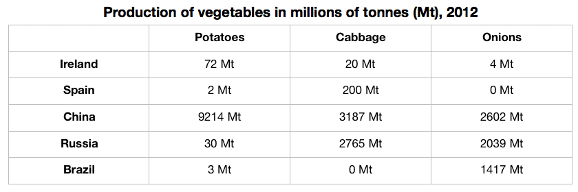 The table compares the amount of 3 different vegetables (potatoes, cabbage and onions) produced in 5 different countries in 2012.