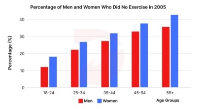 The bar chart shows men and women in different age groups who did not exercises in 2005.