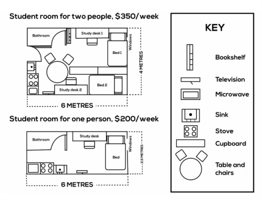The plan below shows a student room for two people and a student room for one person at an Australian university.