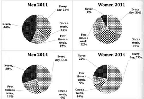 The accompanying pie illustration shows the use of online networking by people in Australia in 2011 and 2014.