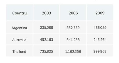 The table below shows the number of cars made in three countries in 2003, 2006 and 2009.